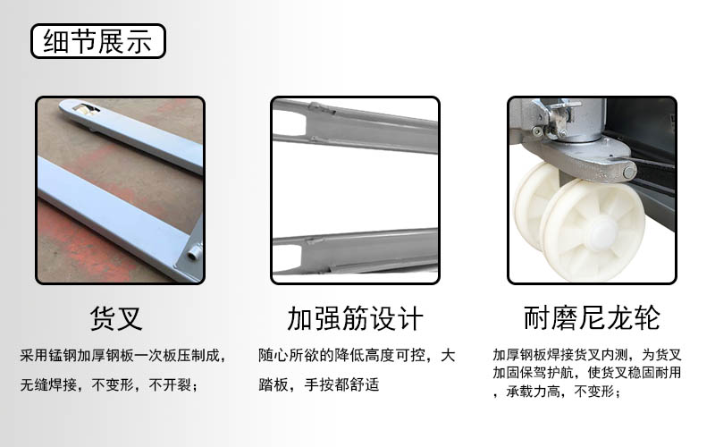 3t手動(dòng)搬運(yùn)車車身采用三菱全自動(dòng)機(jī)器人焊接,位置準(zhǔn)確,焊接標(biāo)準(zhǔn)化,焊口平滑美觀,焊接牢固不開裂;3t手動(dòng)搬運(yùn)車采用整體油缸,防漏油,免維護(hù),內(nèi)置進(jìn)口密封圈,整體閥芯等配件;3t手動(dòng)搬運(yùn)車加厚加筋,提高強(qiáng)度,確保搖臂載重不易變形。產(chǎn)品規(guī)格: