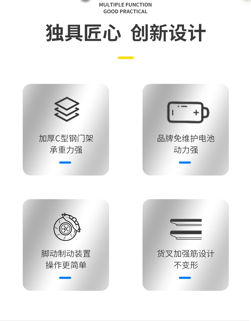 半電動電動堆高車是一款經(jīng)濟實惠的堆高車,配備重載荷油缸,高起升,車體設(shè)計堅固,承載力強。廠家直售,提供批發(fā)電動堆高車價格。半電動電動堆高車采用智能電量顯示儀表,實時監(jiān)測電量。半電動堆高車是電動叉車的一種,是電動升降,人力推拉行走的一款托盤堆垛車。標(biāo)準(zhǔn)載重范圍最大可達2噸,升高3.5米。非標(biāo)可定制寬叉腿,加長貨叉,改三節(jié)門架等.產(chǎn)品規(guī)格: