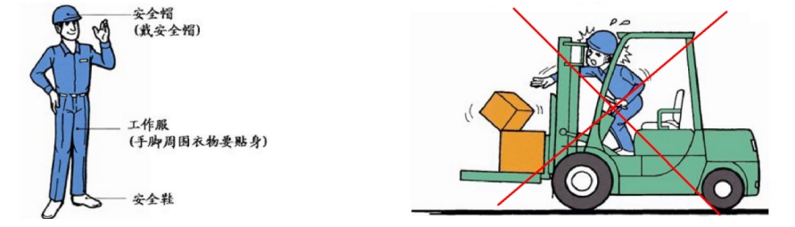 駕駛車輛時,必須穿著工作服、勞保鞋、安全帽。