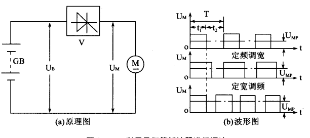 當電動叉車直流串勵電動機晶閘管 V導通時,其端電壓 Um 等于電源電壓 U;當晶閘管 V關斷時電動機與電源斷開,其端電壓 Um 等于零。如果使晶閘管按一定的速度周期性地導通和關斷,則電動機的端電壓 Um 將有如圖2(b) 所示的波形假設晶閘管的導通時間 t(為導通時間寬度),關斷時間為(稱為關斷時間寬度),則電動機端電壓的平均值 Um為: