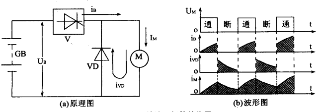 上述定頻調寬及調頻調寬的調速方法,在以后的蓄電池叉車電路中都有應用。在實際應用電路中,還在電動機的兩端并聯一個二極管 VD,稱作續流二極管,如圖2所示。