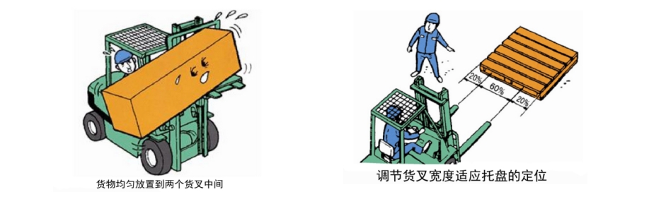 在裝載貨物時(shí),應(yīng)根據(jù)貨物大小來(lái)調(diào)整貨叉的距離,貨物的重量應(yīng)均勻分配在兩貨叉上,以免偏載或開動(dòng)時(shí)貨物向一邊滑落。